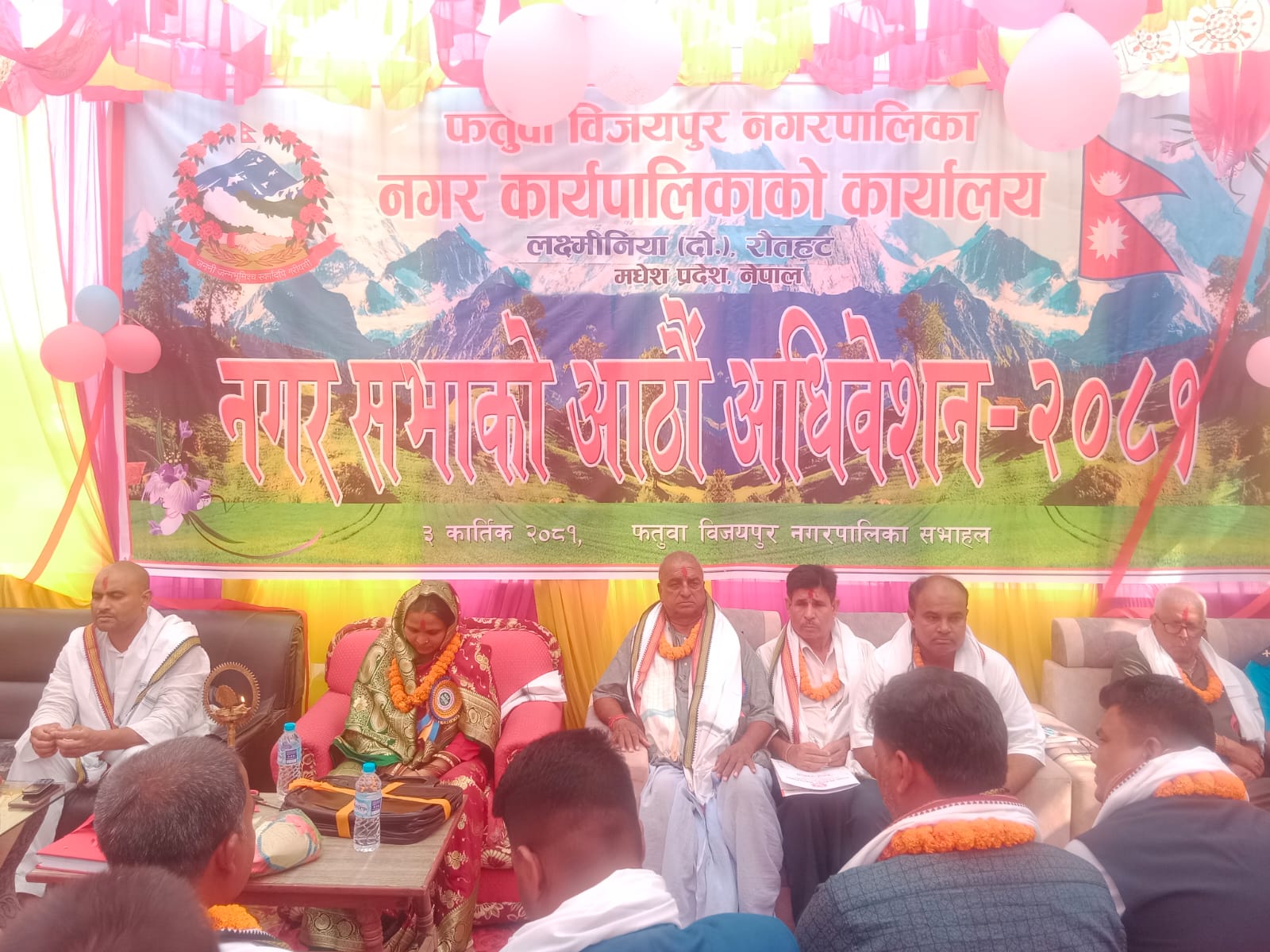 रौतहटको फतुवा बिजयपुर नगरपालिकाले चार महिना ढिलो गरि यस आर्थिक वर्षको लागि ६० करोड भन्दा बढीकाे बजेट पास गरेको छ । फतुवा बिजयपुर नगरपालिकाकाे आठौं नगर सभा तथा बजेट अधिवेशन कार्यक्रम संम्पन भएको हो ।नगरपालिकाको सभाकक्षमा शनिबार भएको आठौं नगरसभाबाट नगरपालिकाले आर्थिक वर्ष २०८१/०८२ का लागि कुल ६०करोड ७७ लाख सात सय ९८ रुपैया बजेट ल्याएको हो । नगरसभाका अध्यक्ष एवं कार्यवाहक नगर प्रमुख अम्बया खातुनकाे निर्देशनमा दुधिअवा क्याम्पसका शिक्षक रंजन खरेलले यस आर्थिक वर्षको नीति, कार्यक्रम तथा बजेट प्रस्तुत गरेका थिए । आर्थिक वर्षमा पुजीगत तर्फ २६ कराेड ४६ लाख ४६ हजार सात सय १० र चालुतर्फ ३४ कराेड ३० लाख५४ हजार ८८ रुपैयाँ बराबरको बजेटलाई शिर्षकगत रुपमा छुट्याएर नगरसभाले सर्वसम्मत पारित गरेको जानकारी दिए ।नेपाली कांग्रेस जिल्ला सभापति तथा मधेस प्रदेश सरकारका नव नियुक्त अर्थमन्त्री सुनिल कुमार यादवकाे प्रमुख आतिथ्य तथा जिल्ला समन्वय समितिका सभापति रामअयाेध्या राय यादवकाे उपस्थितिमा नगरसभा सम्पन्न भएको हो ।कार्यक्रममा अतिथिको रुपमा प्रदेश सभा सदस्य उमेदवार शेख सेराज,नगर प्रमुख पदका