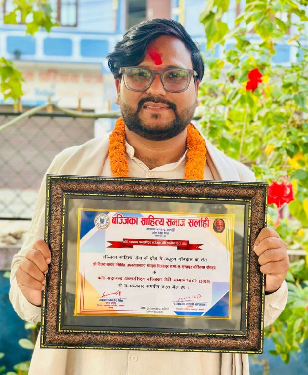 रौतहट, ७ मंसिर । बज्जिका भाषाको उन्नयन र समृद्धिमा महत्वपूर्ण योगदान पु¥याउँदै आएका बज्जिका साहित्यकार विजय यादव ‘निर्विज’ प्रतिष्ठित कवि सदानन्द अन्तर्राष्ट्रिय बज्जिका सेवी सम्मान–२०८२ बाट सम्मानित भएका छन् ।