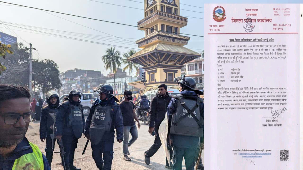 कफ्र्यु क्षेत्र ः पूर्वमा बाइपास रोड, पश्चिममा सिर्सिया पुल, उत्तरमा पावर हाउस चौक र दक्षिणमा शङ्कराचार्य गेटसम्म निर्धारण गरिएको जिल्ला प्रशासन कार्यालय वीरगञ्जले जनाए ।